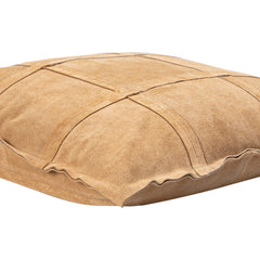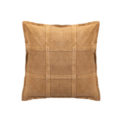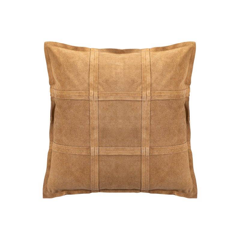 This cushion is made of 100% suede leather with a filling of 100% polyester. This is not machine washable. Only professional dry cleaning is advised.