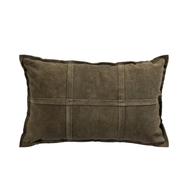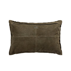 This cushion is made of 100% suede leather with a filling of 100% polyester. This is not machine washable. Only professional dry cleaning is advised.