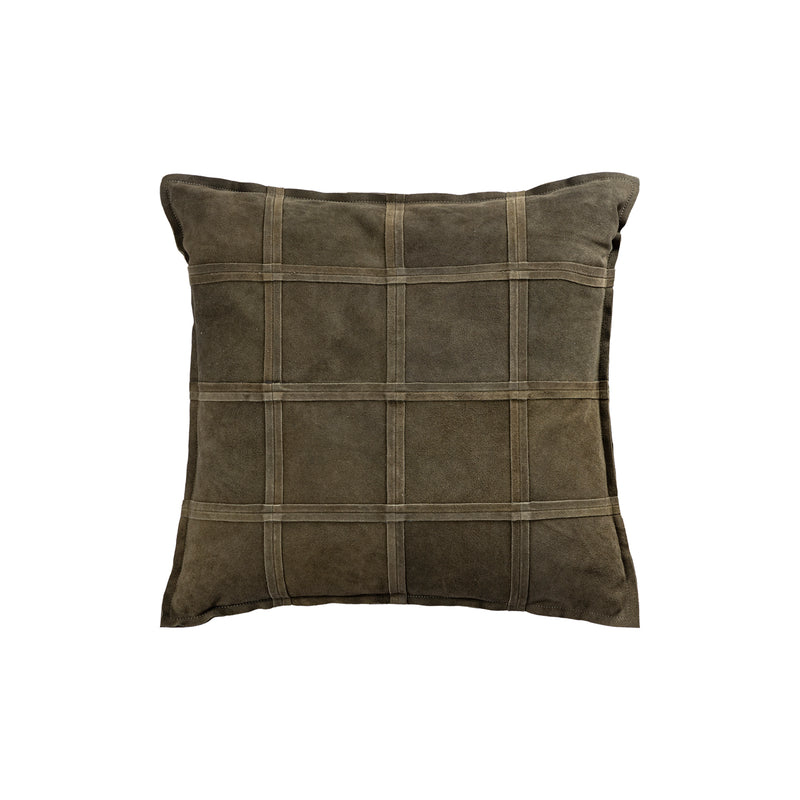 This cushion is made of 100% suede leather with a filling of 100% polyester. This is not machine washable. Only professional dry cleaning is advised.