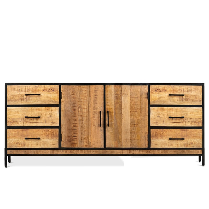 Elegante dressoir uit de GB collectie. Dit dressoir heeft in het midden zes laden en aan weerszijden twee deuren, met daarachter legplanken. Een industriële blikvanger gemaakt van mangohout en staal. De GB collectie straalt rust uit en vormt een solide basis voor elk interieur.