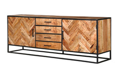 Dressoir Arlington is vervaardigd uit mangohout met visgraatpatroon en metalen frame en handgrepen, afgewerkt met lak. Voorzien van 2 deuren en 4 laden, onderdeel van de 'Arlington serie'. Afmetingen: Breedte: 210 cm, Diepte: 45 cm, Hoogte: 75 cm. Onderhoud: Afnemen met een lichtvochtige doek.