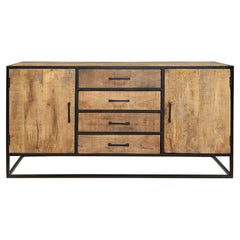 Dit dressoir 'Denver' is vervaardigd uit massief mangohout met een metalen frame. Het heeft vier lades en twee deuren, ingelegd met diverse houten stroken. De metalen elementen hebben een zwarte lak. Afmetingen: Breedte 165 cm, Diepte 45 cm, Hoogte 85 cm. Onderhoud: Afnemen met een lichtvochtige doek.