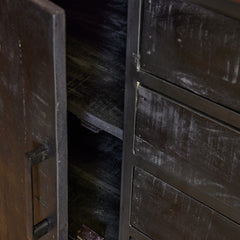 Dit dressoir maakt deel uit van onze Denver Black serie, met vier lades en twee deuren. Vervaardigd uit massief mangohout met zwarte lak. Metalen frame en handgrepen, ook afgewerkt met zwarte lak. Afmetingen: B210 x D45 x H75 cm. Onderhoud: afnemen met een vochtige doek.