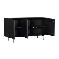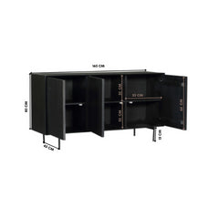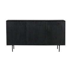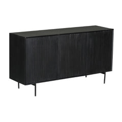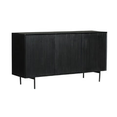 "Dressoir 'Madison' is vervaardigd uit mangohout met een zwart gelakt metalen frame en drie deuren met verticaal lattenpatroon. Afmetingen: Breedte 165 cm, Diepte 45 cm, Hoogte 85 cm. Onderhoud: Afnemen met een lichtvochtige doek."