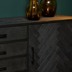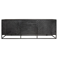 Dressoir 'New York' is vervaardigd uit mangohout met visgraatpatroon en een metalen frame. Het zwarte lakafwerking zorgt voor een strakke uitstraling. Met twee deuren en vier lades maakt dit dressoir de 'New York serie' compleet. Onderhoud met een lichtvochtige doek. Afmetingen: B210 x D45 x H75 cm.