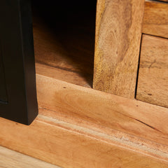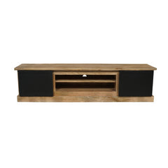 Tv meubel Nashville is gemaakt van gelakt mangohout met zwart gelakt metalen deuren. Met twee deuren en vier lades, en eigentijds karakter door inleg van verschillende houten stroken. Afmetingen: B200 x D45 x H50 cm. Onderhoud: Afnemen met lichtvochtige doek.