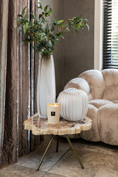 De New Khine salontafels bestaat uit een set van 3 maten tafeltjes. Het onderstel is gemaakt van metaal. Deze set valt voornamelijk op door de tafelbladen. Deze zijn gemaakt van versteend hout. Versteend hout is een natuurproduct welke kan verschillen in kleur van licht tot donker. Deze tafels zijn niet voor buitengebruik en moeten regelmatig schoongemaakt worden met een zachte droge doek. Let op: elk item is uniek en heeft een andere look.
