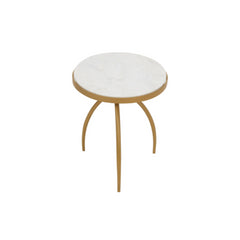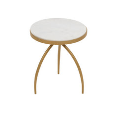 De bijzettafel Kay heeft een wit marmeren blad en een rond metalen onderstel met goudkleurige lak. Afmetingen: Breedte: 40 cm, Diepte: 40 cm, Hoogte: 50 cm. Dikte van het blad: 1,6 cm. Onderhoudsinstructies: Afnemen met een lichtvochtige doek.