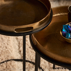 De salontafel Laure bestaat uit twee elegante tafels met aluminium bladen in een warme koper kleur, compleet met een slank, zwart metalen onderstel. Deze set biedt flexibiliteit en stijl, perfect voor elk interieur. Inclusief grote tafeltje (42x42x50 cm) en kleine tafeltje (35x35x57 cm). Afnemen met lichtvochtige doek.