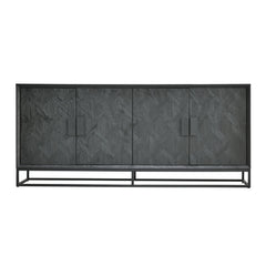 Dressoir 195 met 4 deuren vervaardigd uit massief mangohout met een zwarte gelakte afwerking. Het frame is gemaakt van zwart gepoedercoat metaal. De afmetingen zijn W (cm) 195, D (cm) 42, H (cm) 85.