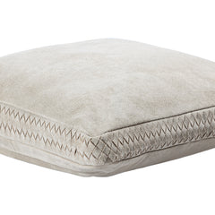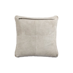 This cushion is made of 100% suede leather with a filling of 100% polyester. This is not machine washable. Only professional dry cleaning is advised.